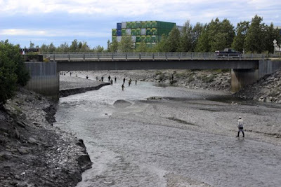 So we decided to walk around the area. We hadn't done that for a number of years and things have been spiffed up. The Bridge Restaurants crosses over Ship Creek and has an upscale menu and there have been lots of improvements. Here's the fanciest outdoor public restroom I've ever seen in Alaska. If you look closely (you may have to click on it to enlarge and focus it) you can see they're labeled Dollies and Chums. It had rained during the night and much of the day, but it was surprisingly warm - low 70s F. And it was windy. Weather reports said it was a remnant of a typhoon in Japan. I'd say we had about 10 mile/hour winds most of the time with gusts over 30 mph.